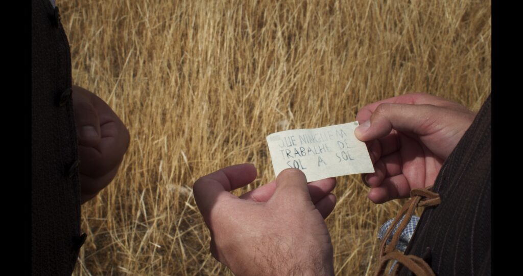 The vine bore fruit and it’s harvest time. Soraia, a young girl, cuts herself. Blood mixes with wine. A black bull is on the loose. Up in the oak trees, time swells, and a community takes shelter. They share bread and wine, memories and dreams, the history of a landscape. We enter a long night, where nature also speaks. The fiery wind that brings the heatwaves is burning.